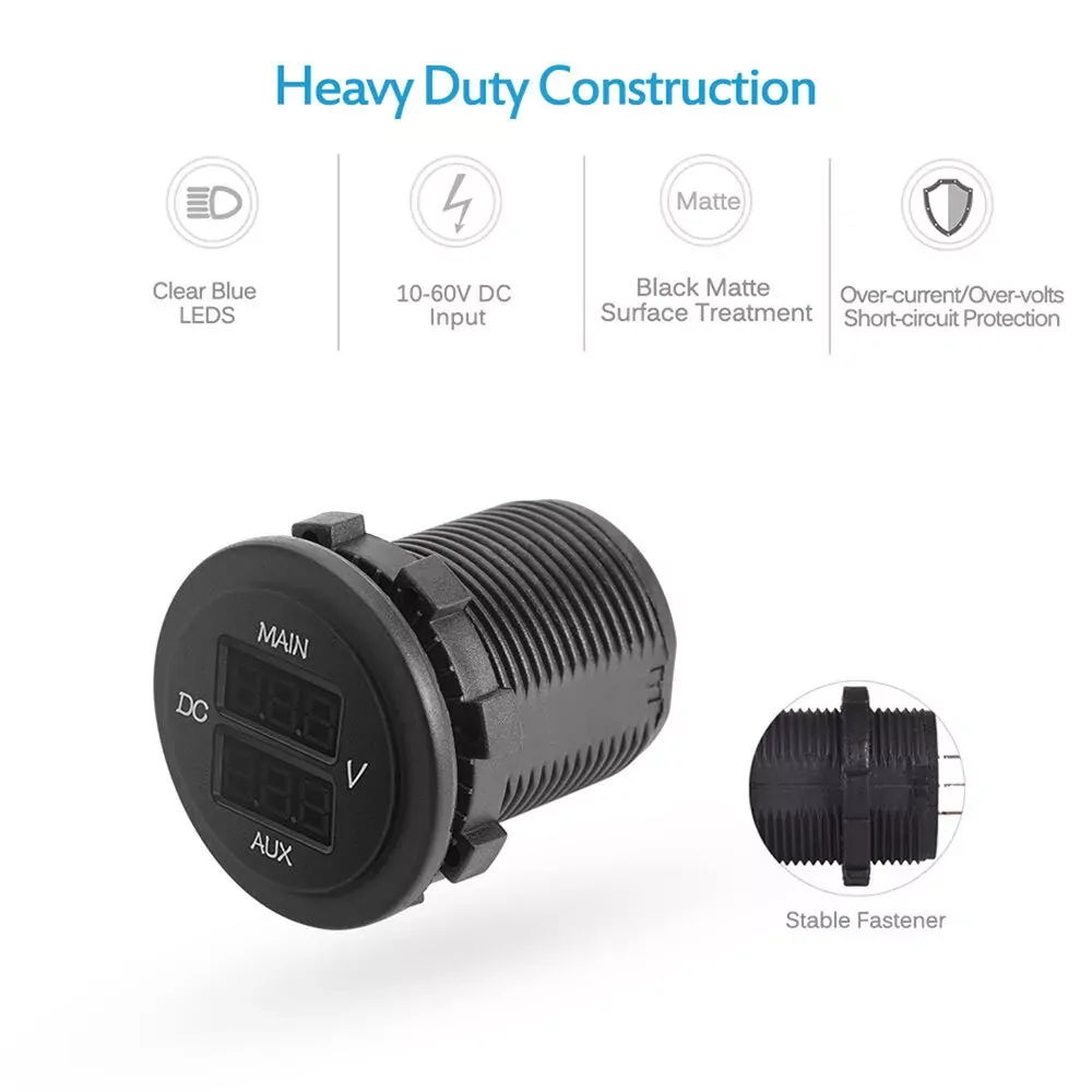 Ideal to monitor the voltage levels of both the main starter battery and the auxiliary (secondary) battery, ensuring the starter battery remains charged to prevent being stranded.