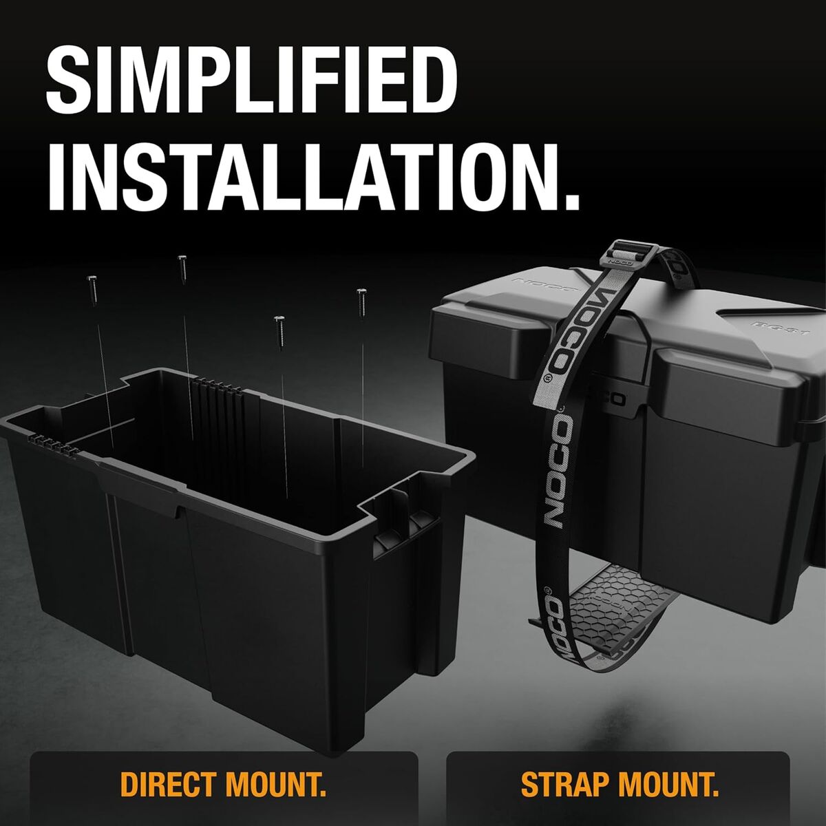 - Installing our battery boxes has never been easier. Utilize the pre-drilled internal pilot holes for direct mounting without a battery strap. Or the all-new strap mount system for more rugged and demanding installations.