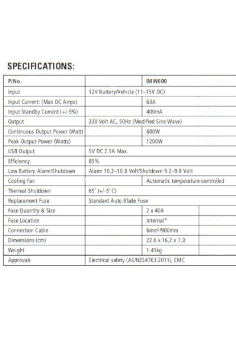 The versatile IMW600 inverter is for those more serious about remote power. It can be permanently mounted inside a vehicle and features twin power outlets to safely run multiple appliances.