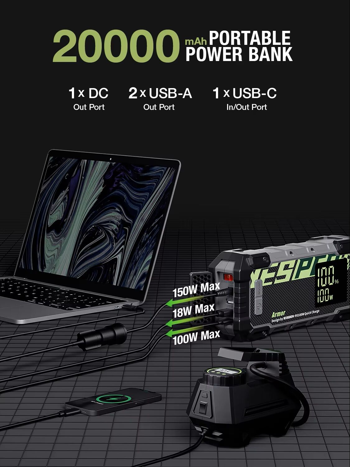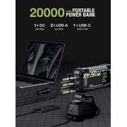 - A 20000 mAh battery, including three USB ports (PD100W TYPE-C 5V/3A In&Out, USB 5V/9V/12V Fast Charging, USB 5V/2.4A)