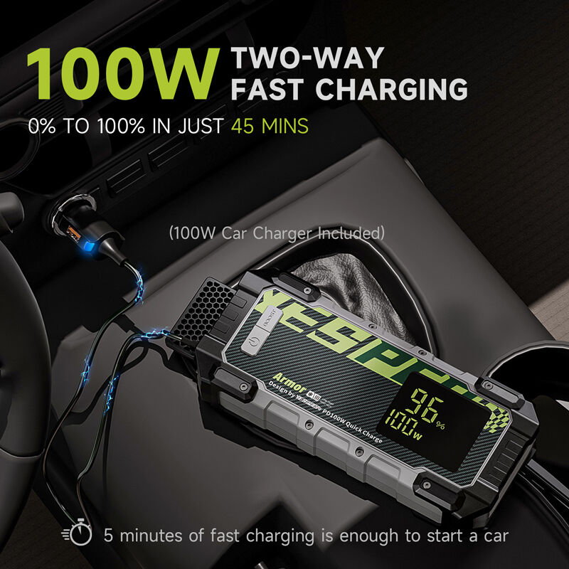 With our 100W car charger, the jump starter can be charged from 0% to 100% in 0.75 hours.Even if you forget to recharge the jump starter before going out, 5 minutes of charging are enough to start a car(When the jump starter is being charged, it will automatically stop the output to protect the battery and your device)